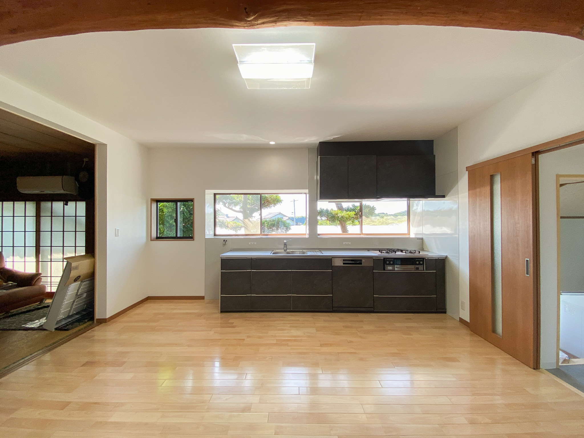 今回の施工事例では、古くなり痛みが目立っていたキッチンを全面的に改修しました。お客様のご要望をもとに家事動線を再検討し、L型キッチンからシンプルで効率的なI型キッチンへと変更。